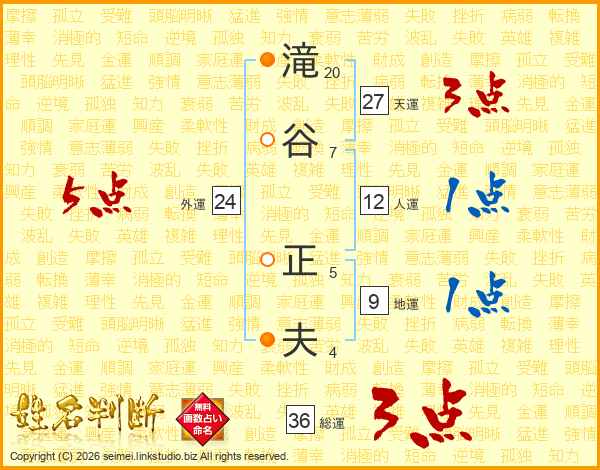 滝(20画)谷(7画) 正(5画)夫(4画)