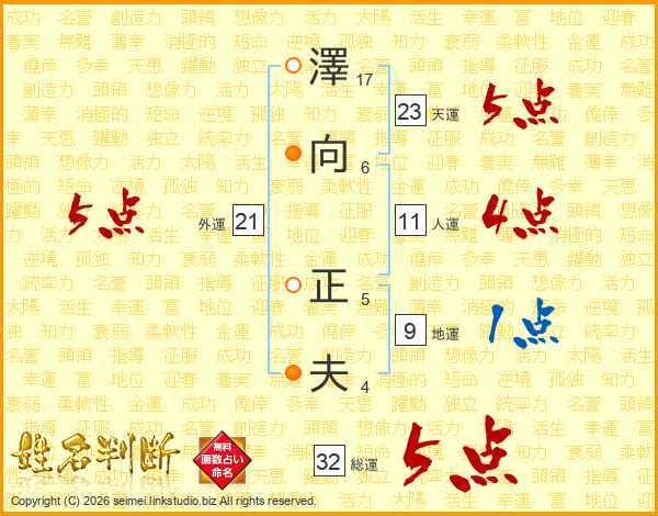 あなたの人生を表す1番重要な運勢です。生涯を通じて影響する総合運となり、主に50歳以降の晩年期に影響を及ぼします。苗字と名前の合計画数。