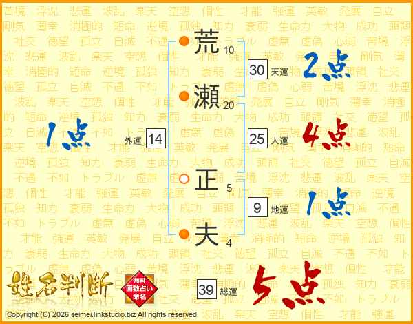 荒(10画)瀬(20画) 正(5画)夫(4画)