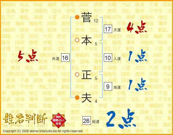 あなたの人生を表す1番重要な運勢です。生涯を通じて影響する総合運となり、主に50歳以降の晩年期に影響を及ぼします。苗字と名前の合計画数。