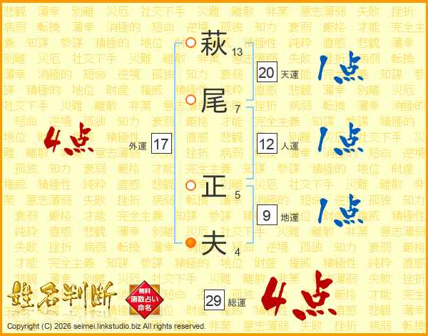 萩尾正夫さんの総運は29画の4点!