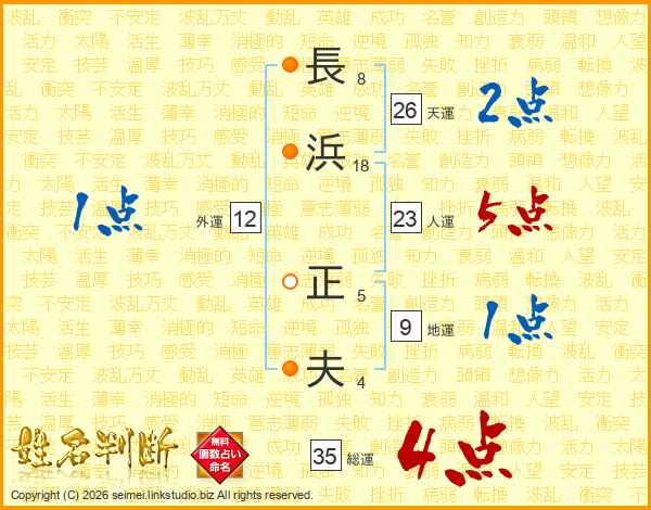 あなたの人生を表す1番重要な運勢です。生涯を通じて影響する総合運となり、主に50歳以降の晩年期に影響を及ぼします。苗字と名前の合計画数。
