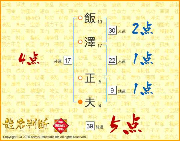 飯(13画)澤(17画) 正(5画)夫(4画)