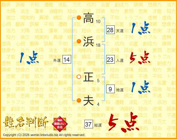 あなたの人生を表す1番重要な運勢です。生涯を通じて影響する総合運となり、主に50歳以降の晩年期に影響を及ぼします。苗字と名前の合計画数。