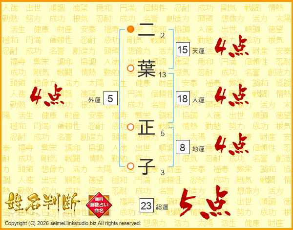 二(2画)葉(13画) 正(5画)子(3画)