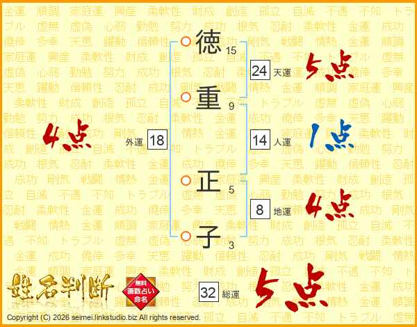 徳(15画)重(9画) 正(5画)子(3画)