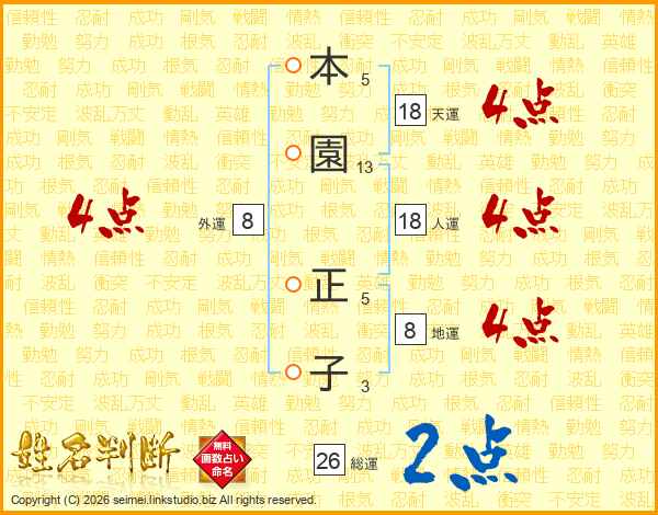 あなたの人生を表す1番重要な運勢です。生涯を通じて影響する総合運となり、主に50歳以降の晩年期に影響を及ぼします。苗字と名前の合計画数。
