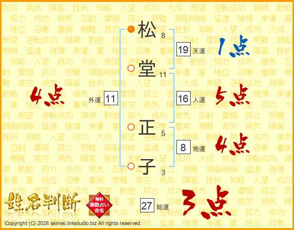 あなたの人生を表す1番重要な運勢です。生涯を通じて影響する総合運となり、主に50歳以降の晩年期に影響を及ぼします。苗字と名前の合計画数。