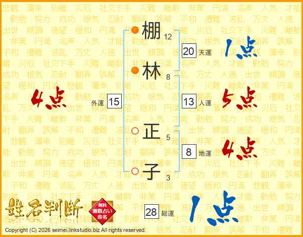 あなたの人生を表す1番重要な運勢です。生涯を通じて影響する総合運となり、主に50歳以降の晩年期に影響を及ぼします。苗字と名前の合計画数。