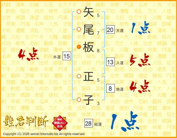 生活面を象徴する運勢です。外部から受ける影響力を表し、結婚運、家庭運や職場、環境への順応性を表します。総運から人運を引いた画数。姓や名が1文字の場合を除く。