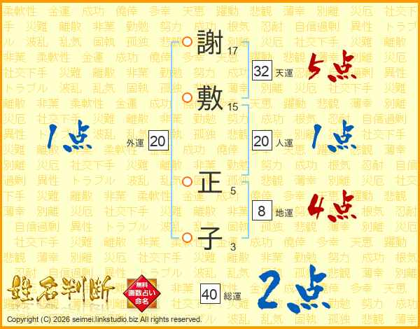 生活面を象徴する運勢です。外部から受ける影響力を表し、結婚運、家庭運や職場、環境への順応性を表します。総運から人運を引いた画数。姓や名が1文字の場合を除く。