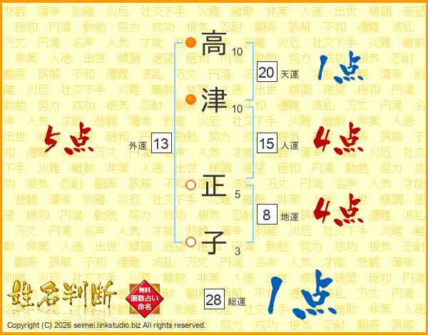 生活面を象徴する運勢です。外部から受ける影響力を表し、結婚運、家庭運や職場、環境への順応性を表します。総運から人運を引いた画数。姓や名が1文字の場合を除く。