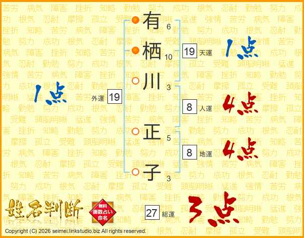 有(6画)栖(10画)川(3画) 正(5画)子(3画)