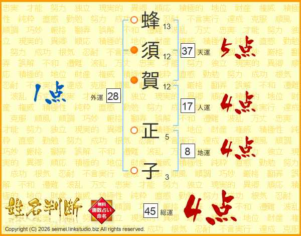 蜂(13画)須(12画)賀(12画) 正(5画)子(3画)