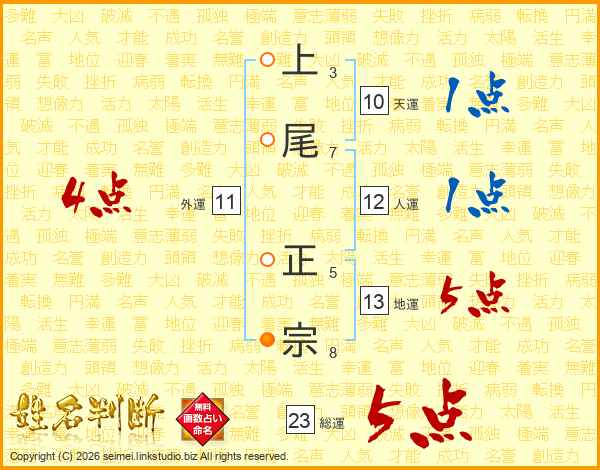 あなたの人生を表す1番重要な運勢です。生涯を通じて影響する総合運となり、主に50歳以降の晩年期に影響を及ぼします。苗字と名前の合計画数。