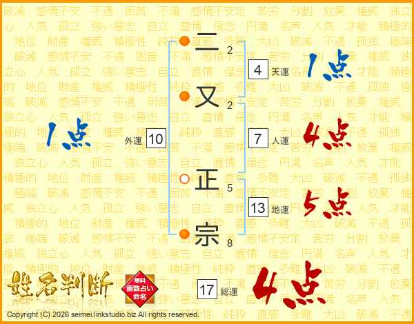 生活面を象徴する運勢です。外部から受ける影響力を表し、結婚運、家庭運や職場、環境への順応性を表します。総運から人運を引いた画数。姓や名が1文字の場合を除く。