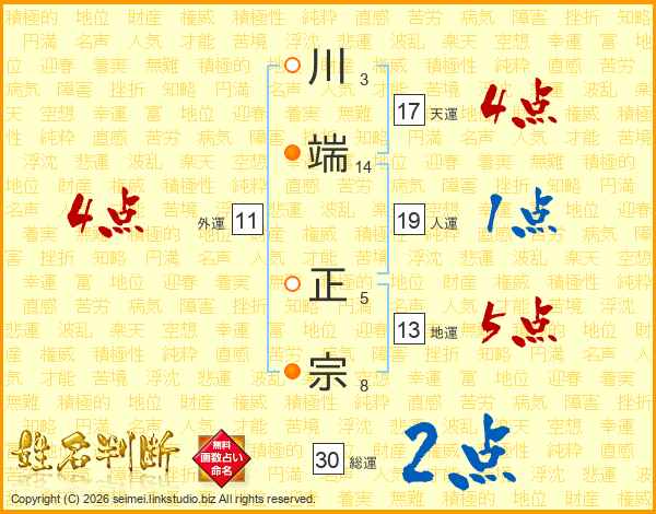あなたの人生を表す1番重要な運勢です。生涯を通じて影響する総合運となり、主に50歳以降の晩年期に影響を及ぼします。苗字と名前の合計画数。