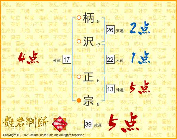 柄(9画)沢(17画) 正(5画)宗(8画)