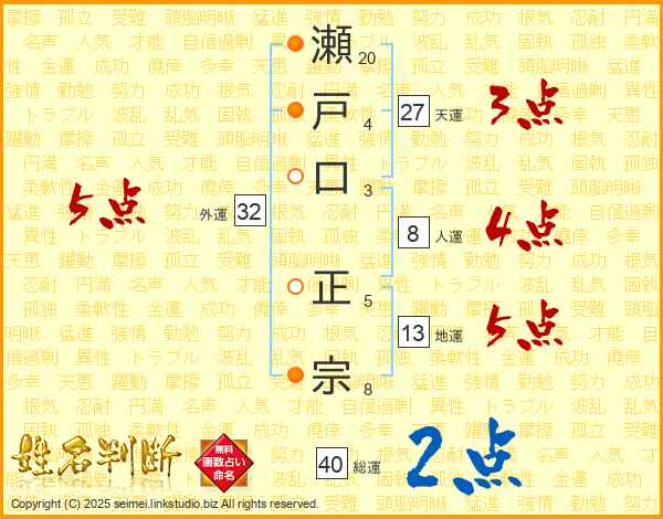 瀬(20画)戸(4画)口(3画) 正(5画)宗(8画)