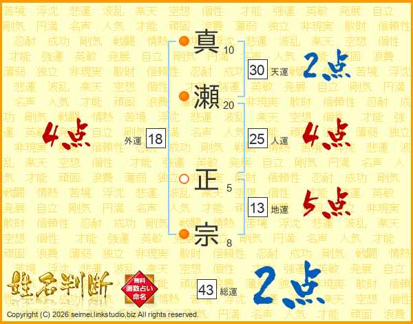 真(10画)瀬(20画) 正(5画)宗(8画)