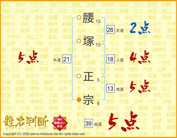 腰(13画)塚(13画) 正(5画)宗(8画)