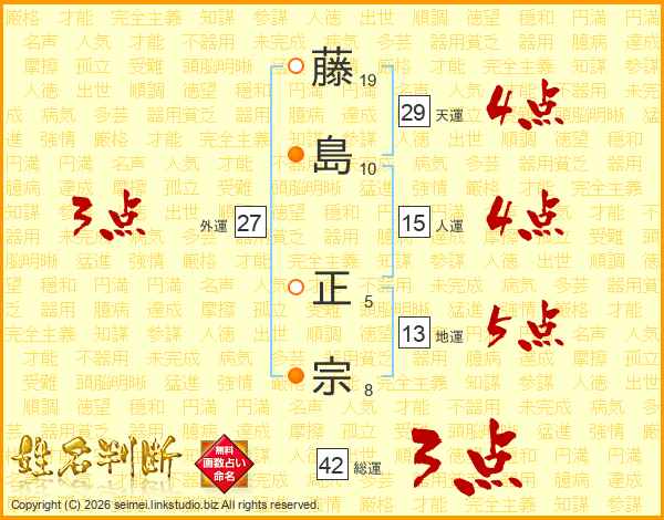 あなたの人生を表す1番重要な運勢です。生涯を通じて影響する総合運となり、主に50歳以降の晩年期に影響を及ぼします。苗字と名前の合計画数。