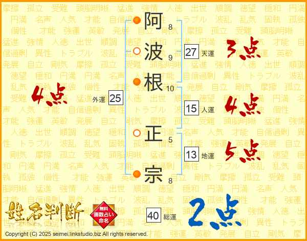 阿(8画)波(9画)根(10画) 正(5画)宗(8画)