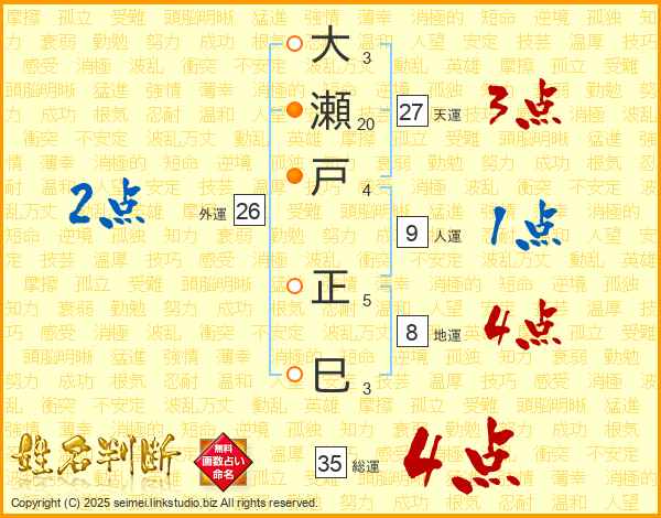 大(3画)瀬(20画)戸(4画) 正(5画)巳(3画)