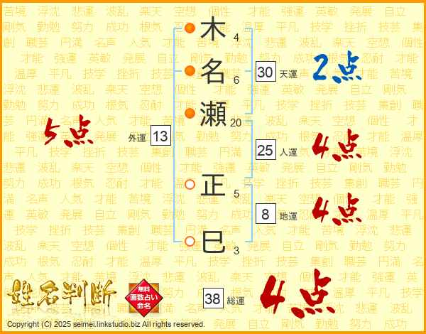 木(4画)名(6画)瀬(20画) 正(5画)巳(3画)