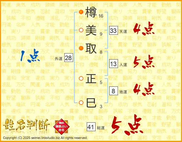樽(16画)美(9画)取(8画) 正(5画)巳(3画)