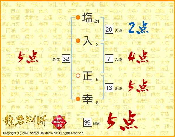 生活面を象徴する運勢です。外部から受ける影響力を表し、結婚運、家庭運や職場、環境への順応性を表します。総運から人運を引いた画数。姓や名が1文字の場合を除く。