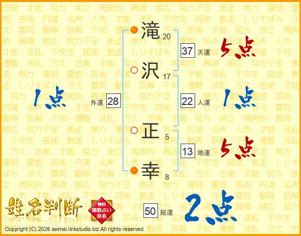 滝(20画)沢(17画) 正(5画)幸(8画)