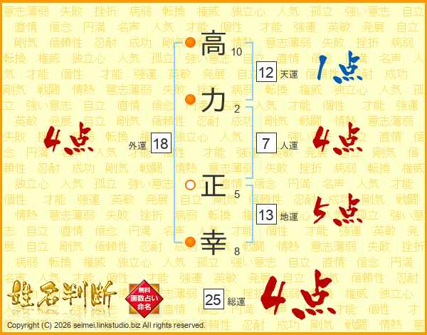 あなたの人生を表す1番重要な運勢です。生涯を通じて影響する総合運となり、主に50歳以降の晩年期に影響を及ぼします。苗字と名前の合計画数。