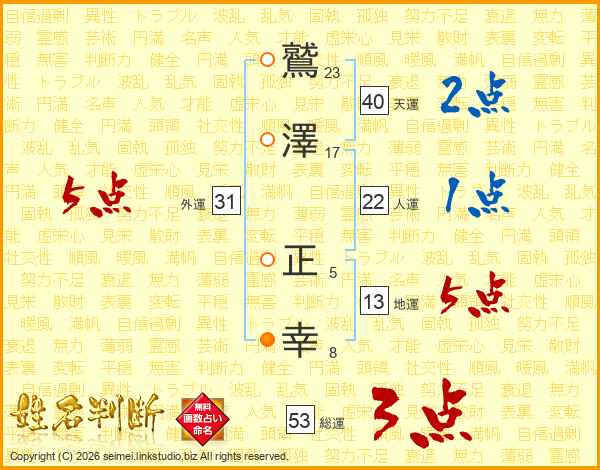 鷲(23画)澤(17画) 正(5画)幸(8画)