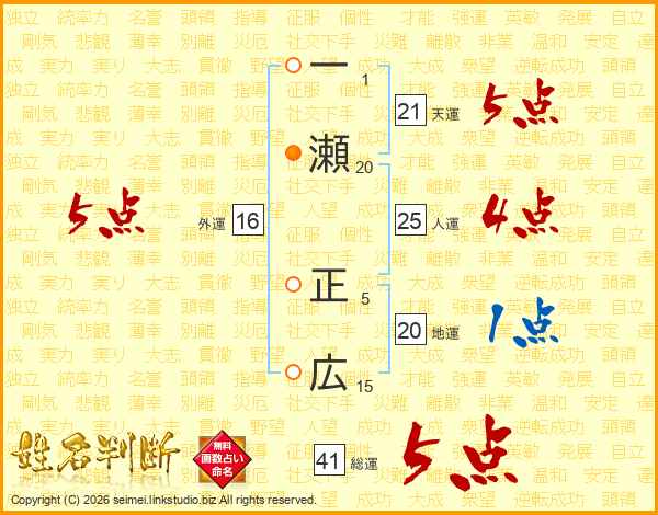 あなたの人生を表す1番重要な運勢です。生涯を通じて影響する総合運となり、主に50歳以降の晩年期に影響を及ぼします。苗字と名前の合計画数。