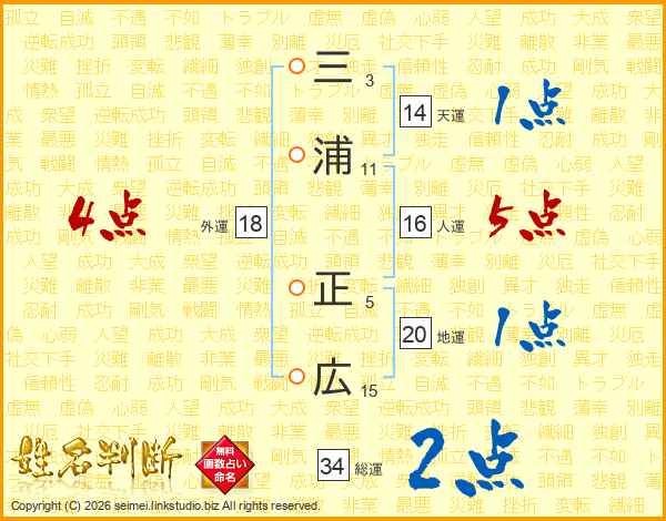 生活面を象徴する運勢です。外部から受ける影響力を表し、結婚運、家庭運や職場、環境への順応性を表します。総運から人運を引いた画数。姓や名が1文字の場合を除く。