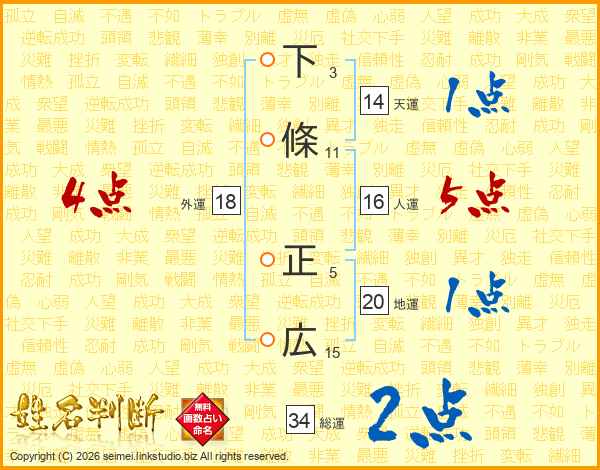 あなたの人生を表す1番重要な運勢です。生涯を通じて影響する総合運となり、主に50歳以降の晩年期に影響を及ぼします。苗字と名前の合計画数。