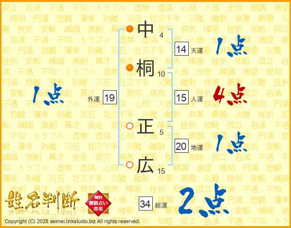 あなたの人生を表す1番重要な運勢です。生涯を通じて影響する総合運となり、主に50歳以降の晩年期に影響を及ぼします。苗字と名前の合計画数。