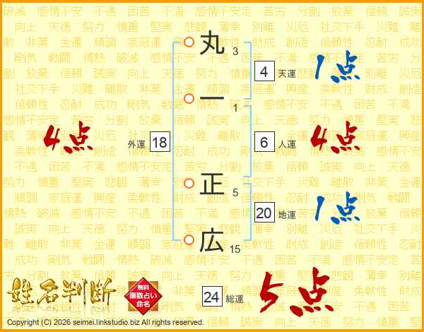 あなたの人生を表す1番重要な運勢です。生涯を通じて影響する総合運となり、主に50歳以降の晩年期に影響を及ぼします。苗字と名前の合計画数。