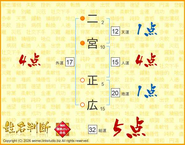 生活面を象徴する運勢です。外部から受ける影響力を表し、結婚運、家庭運や職場、環境への順応性を表します。総運から人運を引いた画数。姓や名が1文字の場合を除く。