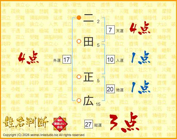 生活面を象徴する運勢です。外部から受ける影響力を表し、結婚運、家庭運や職場、環境への順応性を表します。総運から人運を引いた画数。姓や名が1文字の場合を除く。