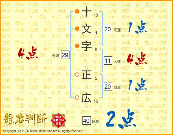 画数の奇数(○陽)と偶数(●陰)の配列で吉凶を占います。どちらかにかたよる名前は大凶名で避ける必要があります。画数の奇数偶数。