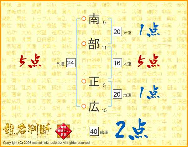 あなたの人生を表す1番重要な運勢です。生涯を通じて影響する総合運となり、主に50歳以降の晩年期に影響を及ぼします。苗字と名前の合計画数。