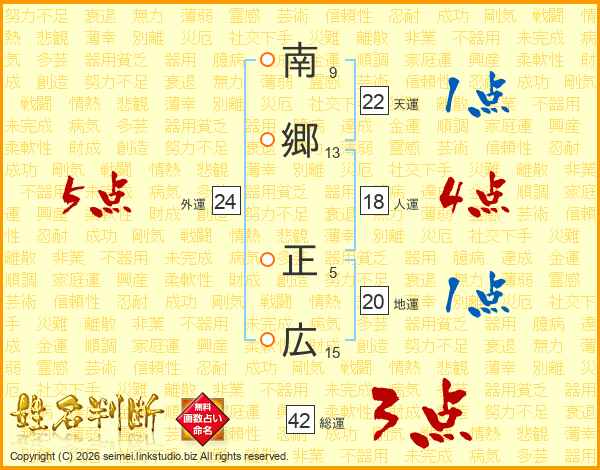 あなたの人生を表す1番重要な運勢です。生涯を通じて影響する総合運となり、主に50歳以降の晩年期に影響を及ぼします。苗字と名前の合計画数。