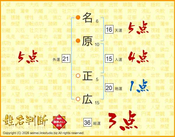 名(6画)原(10画) 正(5画)広(15画)