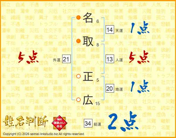 あなたの人生を表す1番重要な運勢です。生涯を通じて影響する総合運となり、主に50歳以降の晩年期に影響を及ぼします。苗字と名前の合計画数。