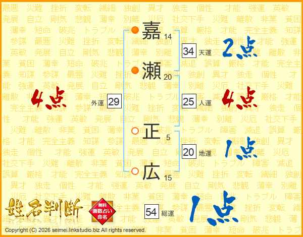 嘉(14画)瀬(20画) 正(5画)広(15画)