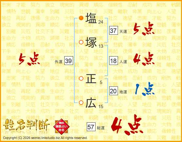 あなたの人生を表す1番重要な運勢です。生涯を通じて影響する総合運となり、主に50歳以降の晩年期に影響を及ぼします。苗字と名前の合計画数。