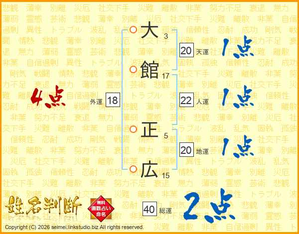あなたの人生を表す1番重要な運勢です。生涯を通じて影響する総合運となり、主に50歳以降の晩年期に影響を及ぼします。苗字と名前の合計画数。