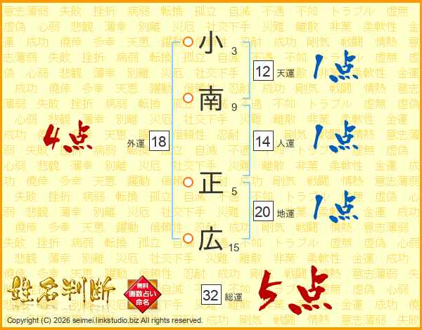 生活面を象徴する運勢です。外部から受ける影響力を表し、結婚運、家庭運や職場、環境への順応性を表します。総運から人運を引いた画数。姓や名が1文字の場合を除く。